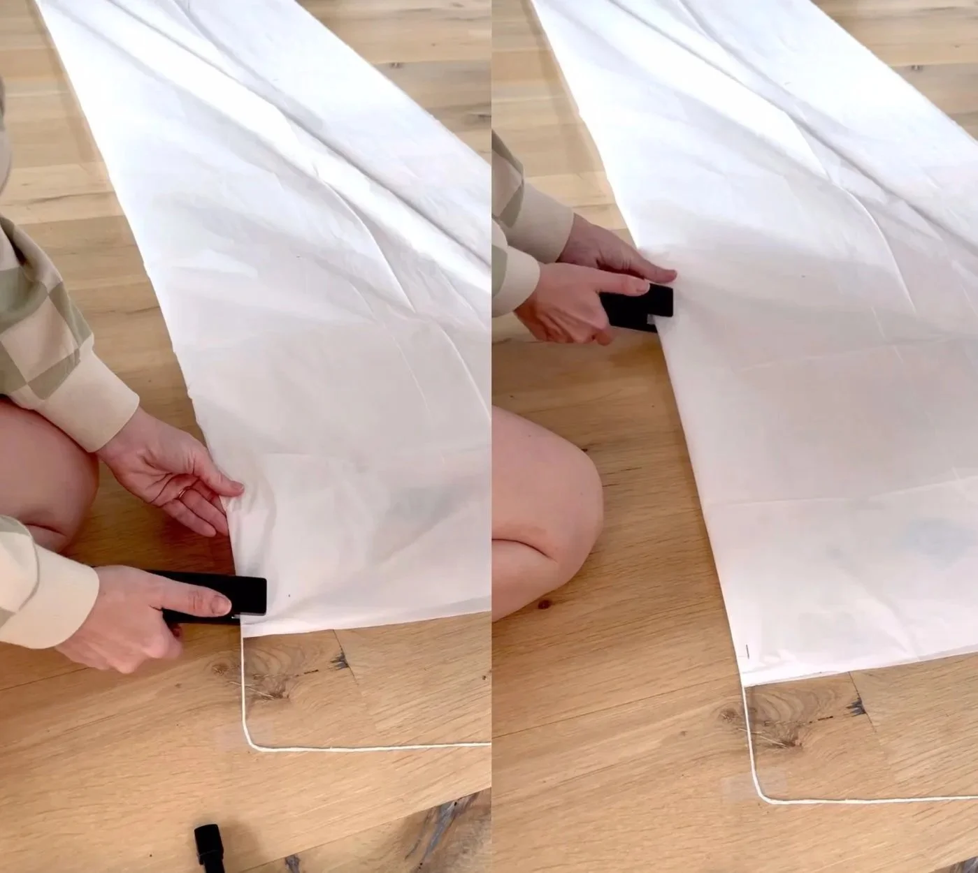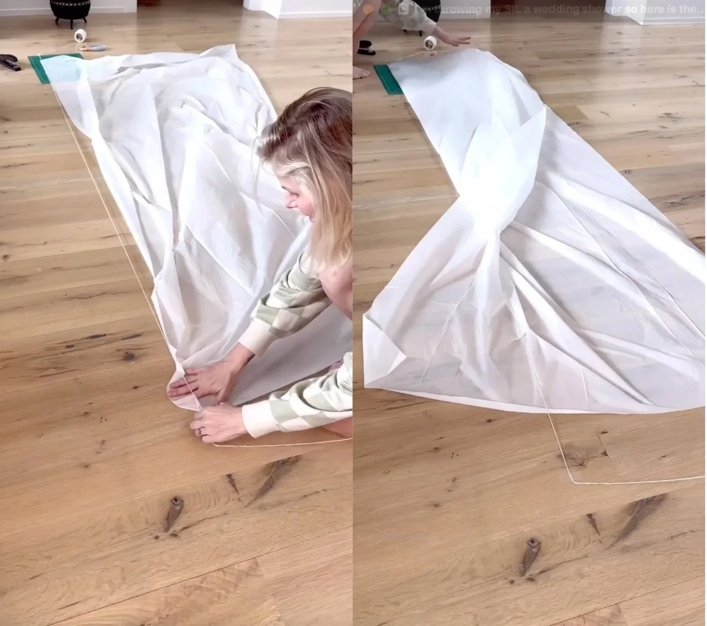 Start by laying out your string (or twine, ribbon, whatever you have) on the floor and tape it down so it stays in place. Then, spread out your plastic tablecloth on the floor and scoot it underneath the string. Fold the tablecloth in half over the string so it drapes evenly on both sides.