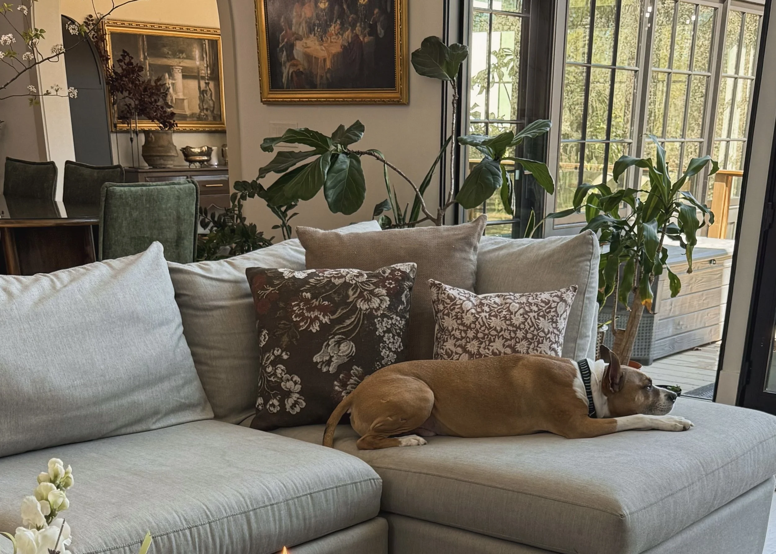 My sunroom is full of happy real plants like my monstera, snake plant, and money tree, and three small real plants under a console table that has a hidden grow light. They’re thriving, and I love seeing that little burst of green when I walk by. However, the white flower arrangement on the coffee table is faux from an estate sale.