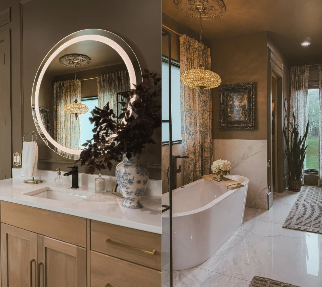 Our primary bathroom finally got the moody makeover it’s been begging for. I kept all of the plumbing fixtures and those round backlit mirrors the same, but everything else got a cozy, color-drenched upgrade.